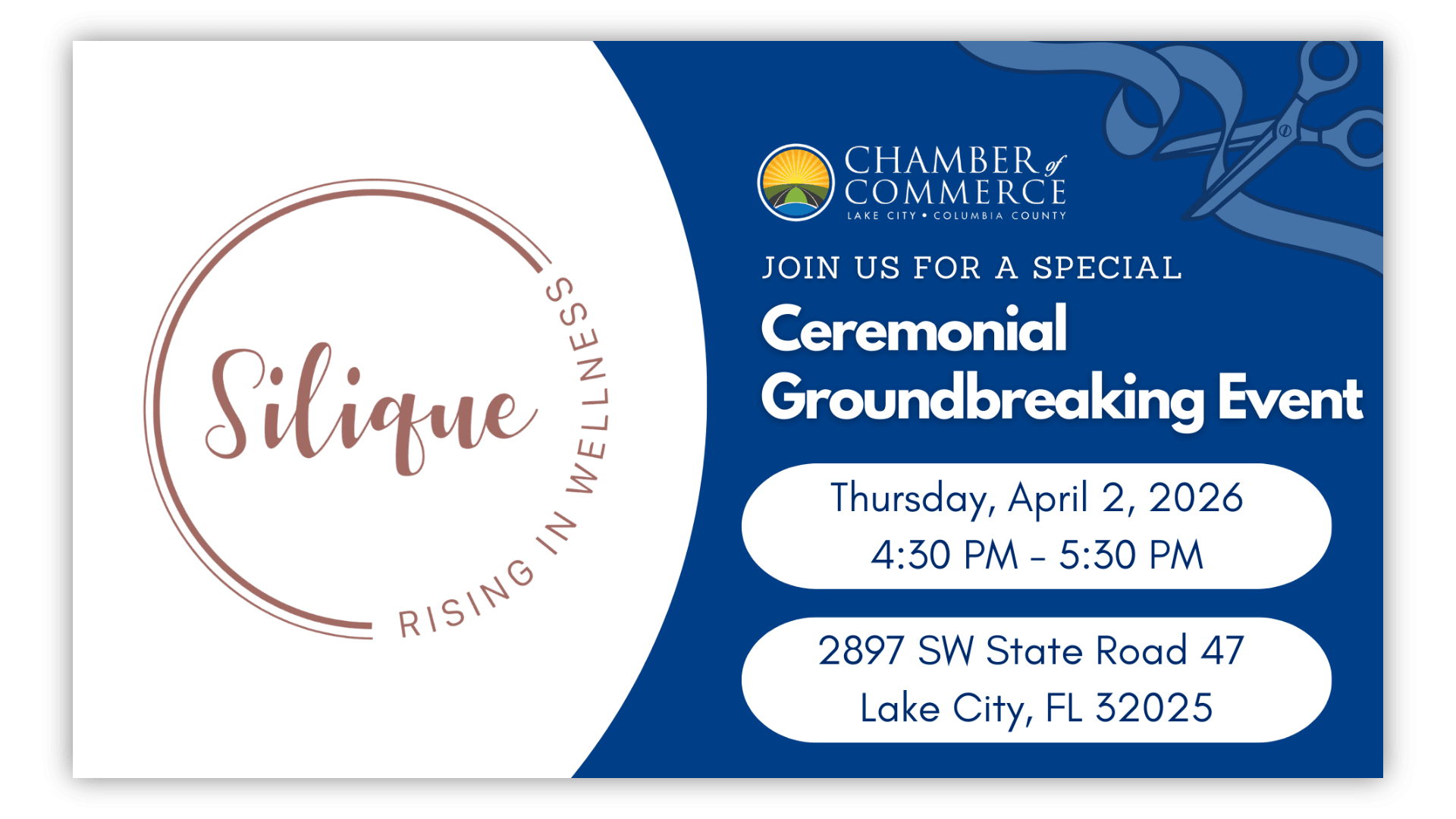 Silique Wellness, along with the Chamber of Commerce, Board of Directors, and your fellow members, invite everyone to celebrate a very special Ceremonial Groundbreaking event on Thursday, April 2, 2026, at 4:30 pm, for their new facility off State Road 47.
